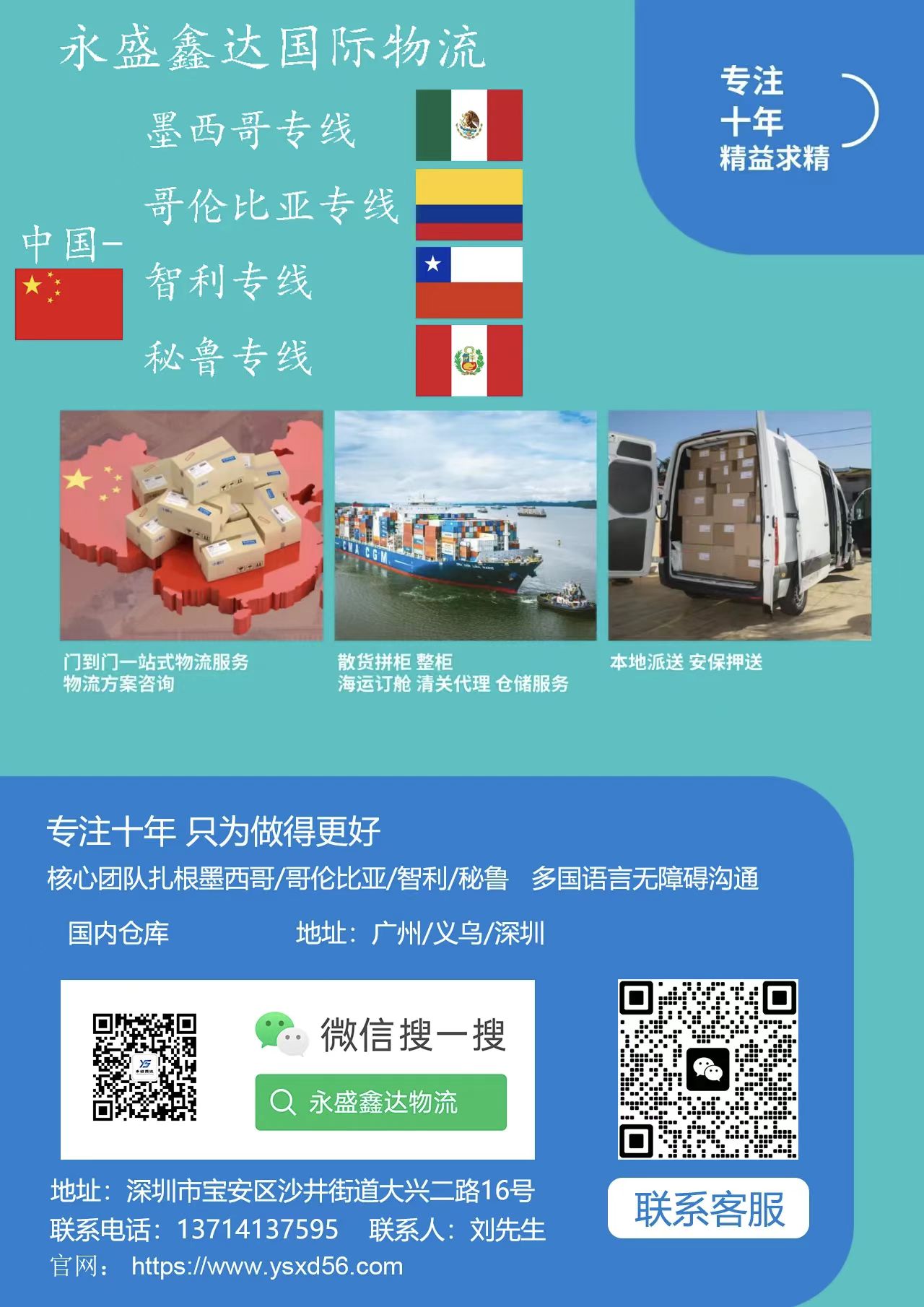 永盛鑫达深耕拉美跨境物流专注服务墨西哥、哥伦比亚、秘鲁、智利,提供门到门一站式供应链服务,全流程无需多环节对接。义乌、广州、深圳自有仓库,可就近入仓省时节本,适配电商小件、大宗货物等需求,让拉美跨境运输更高效省心