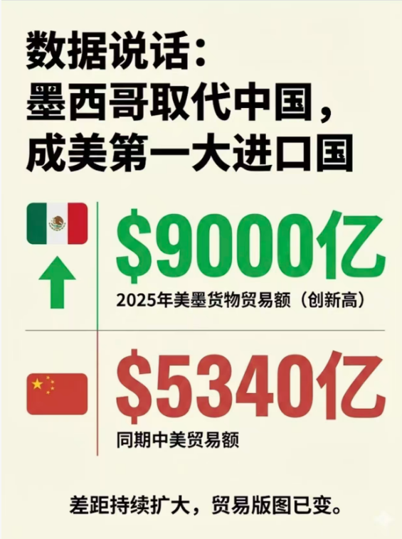 2025年数据反转揭示贸易格局剧变:关税浪潮中,墨西哥悄然崛起成为美国进口新霸主。 一、关税风暴下的“意外赢家”特朗普时代开启的全球加税浪潮,本意是保护美国本土产业,却意外造就了一个意想不到的受益者——墨西哥。 关键数据对比:
